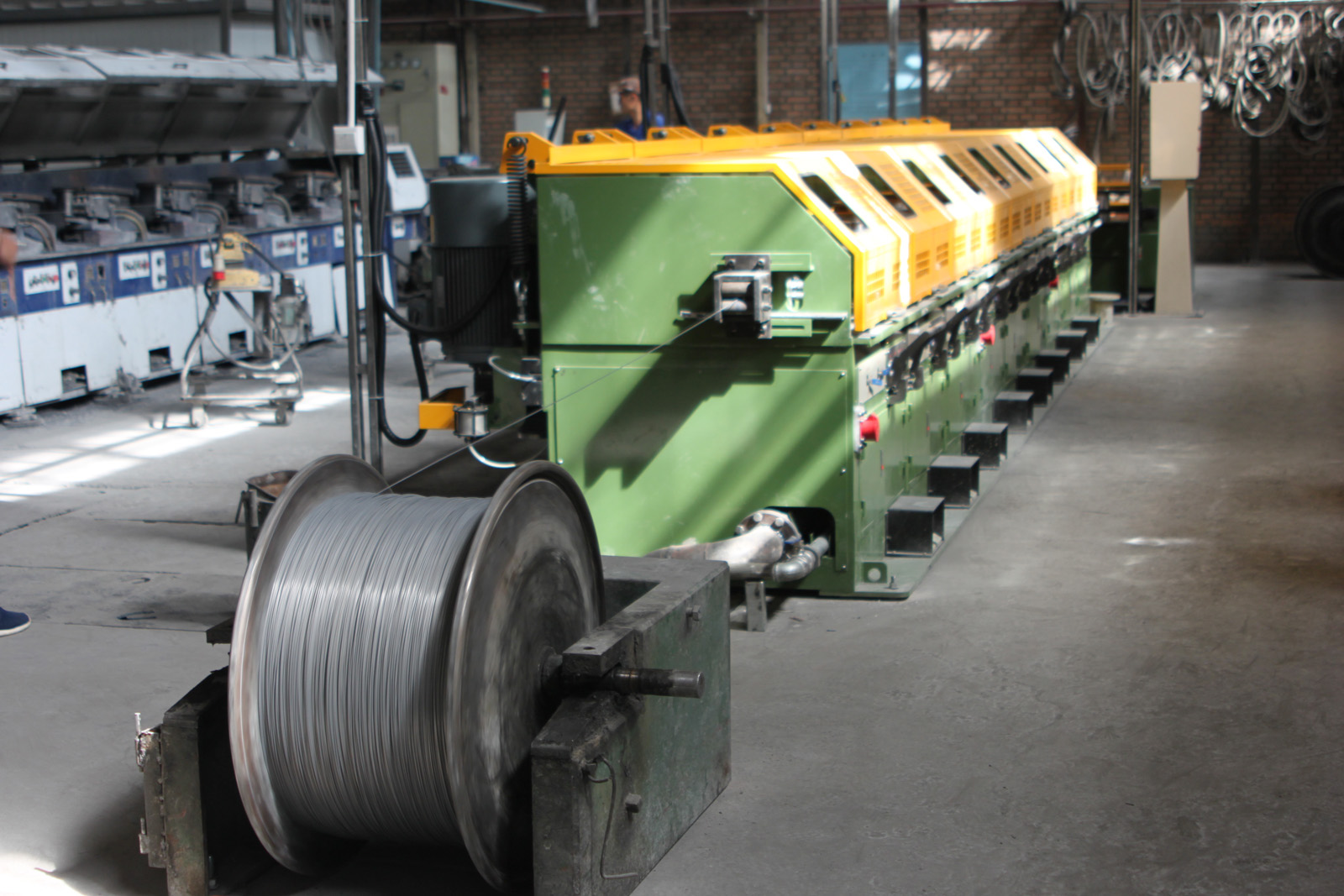 图为该公司8350拔丝机正在生产圆珠笔头用不锈钢材料。
